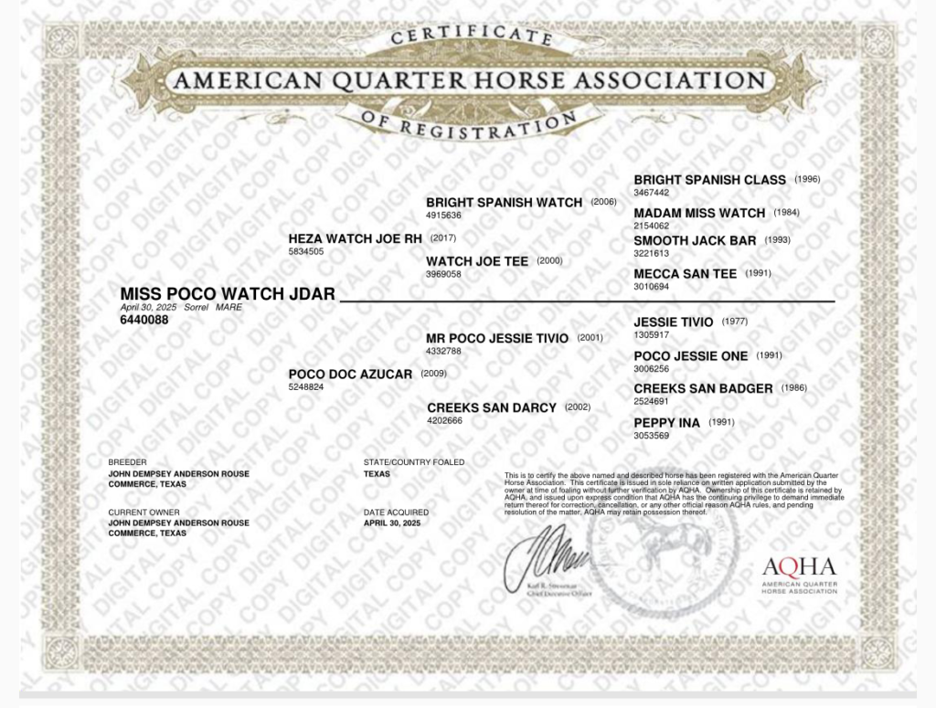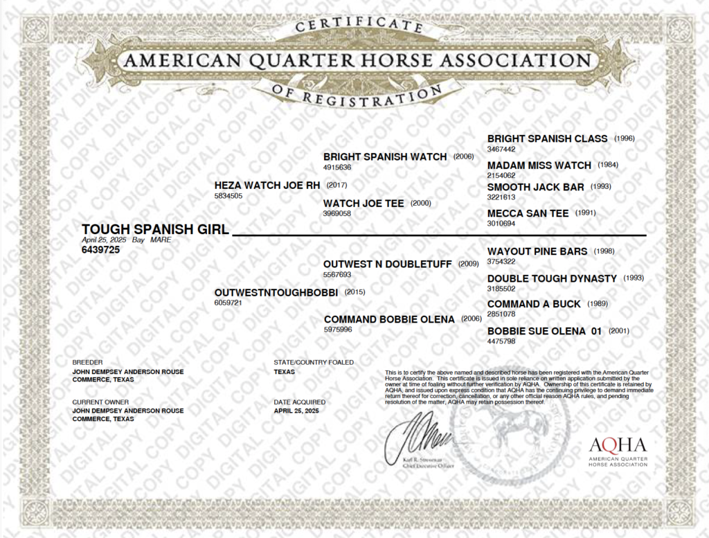 Patty is a 2025 AQHA registered bay filly sired by HEZA WATCH JOE RH and out of a Command Bobbie Olena mare.